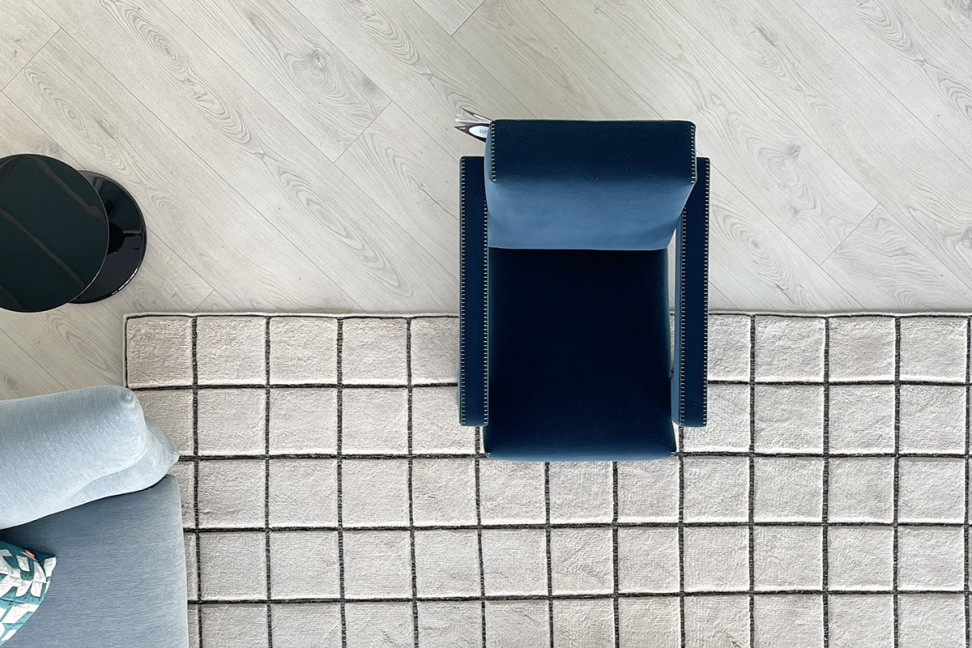 The Utrecht armchair on expo offer in our showroom has blue velvet upholstery and horse stitching that defines its perimeter.