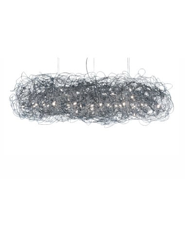 Nuvola is one of Enzo Catellani's most striking creations and, like all the other lamps in the series, is composed entirely of a voluminous weave of natural aluminium wires containing LED light points that, once switched on, illuminate the lamp from within, giving shape and dynamism to the entire structure and creating a unique and magical atmosphere in the room. Although attached to the ceiling by means of cables and a solid nickel metal base, the Nuvola pendant lamp seems to float freely in the air, capturing the attention of the beholder.
