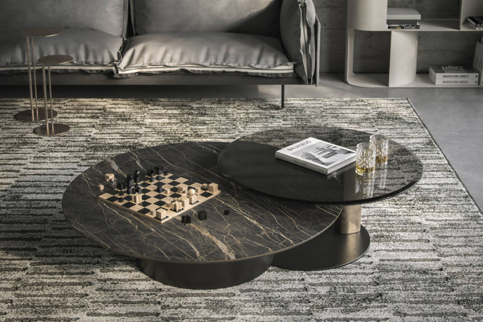 The new version of the Arena Keramik Bond coffee table, by Yasuhiro Shito for Cattelan Italia, skilfully balances the finest finishes of the coffee table collection, introducing a splendid new feature: the marble-effect ceramic top. This fascinating material differs from previous models, which featured a Brushed finish. The Arena Keramik Bond coffee table consists of a main ceramic top, accompanied by a round, swivelling smoked glass table. The latter is supported by an elegant hand-brushed column, also with a Brushed finish. The entire composition of volumes, heights and finishes completes the space that it furnishes with a modern design, highlighting both the elegance of the materials and the sobriety of the forms. The design of this coffee table is characterised by its simplicity; the eclectic symphony of modern and nature-inspired materials lends a fluid harmony to the surroundings. Every detail has been taken care of by the designer to achieve a result with a strong aesthetic impact, without neglecting the functionality of a spacious table top.