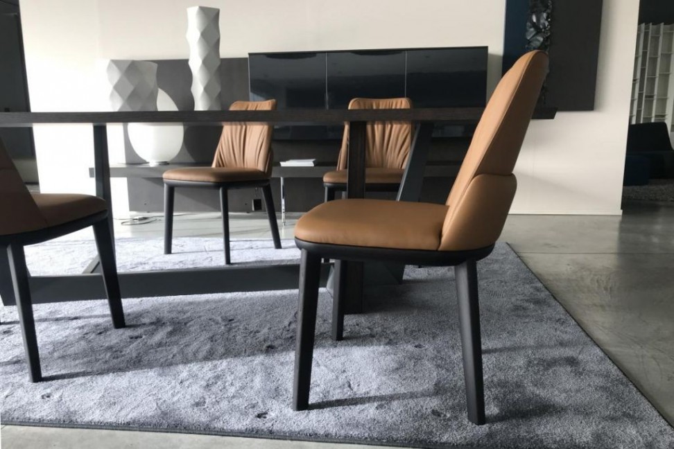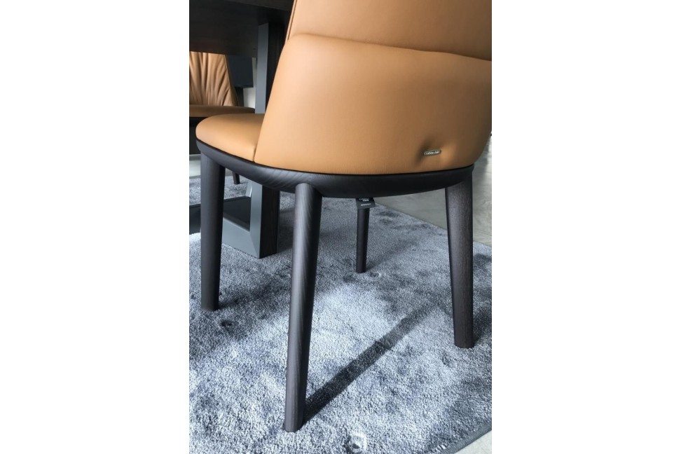 The Belinda chair, in expo offer in our showroom, is the ideal piece of furniture to be included in modern living areas, without neglecting refinement, obtained through the well-studied combination of cognac-coloured leather upholstery and the base in burned oak-stained ash.
