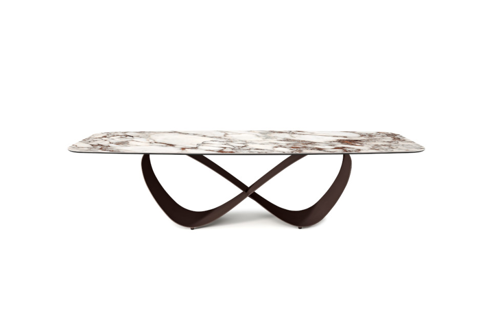 The style is sculptural and harmonious at the same time, thanks to the steel base modeled to recall the soft lines of a butterfly. The Butterfly Keramik table top is available in a wide range of Marmi ceramics and in two sizes, both in the shaped version and in the rectangular version.