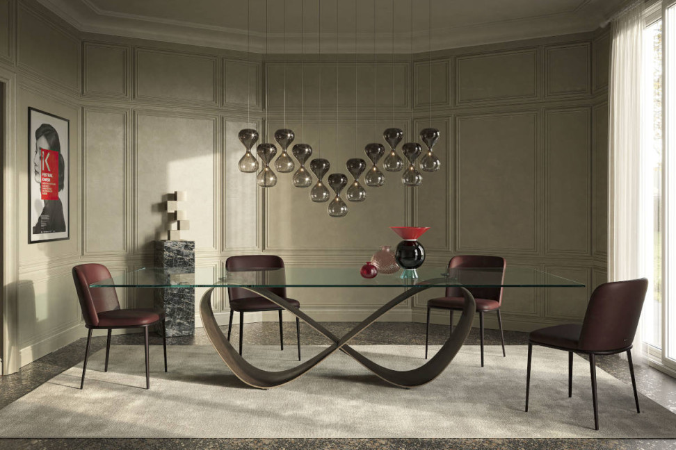 The Butterfly dining table, designed by Nucleo+ studio for Cattelan Italia, features a painted steel base in different finishes recalls the symbol of infinity, while the glass top, with its apparent fragility, it contrasts with the combination of curves and angles with a decisive and revolutionary style. The Butterfly table is available in different sizes and in the version with rectangular or oval top.