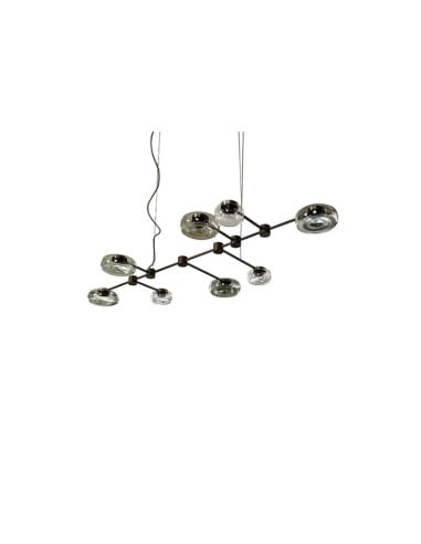 The Circuit suspension lamp is available in both a ceiling and wall version in various sizes, both composed of a painted steel structure embossed in titanium and satin nickel with large lampshades in smoked borosilicate glass and small lampshades in transparent borosilicate glass.