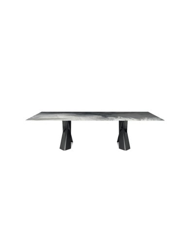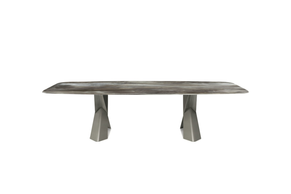 The Mad Max table, designed by Paolo Cattelan for his own company, is characterised by a steel base that takes the form of two parallel X's and supports the top in the luxurious variants available: Mad Max Wood or Masterwood, Mad Max Keramik and Mad Max Keramik Premium, and, finally, Mad Max Crystalart, which offers an ultra-transparent 12 mm glass top with an artistic decoration printed in two different colour shades.