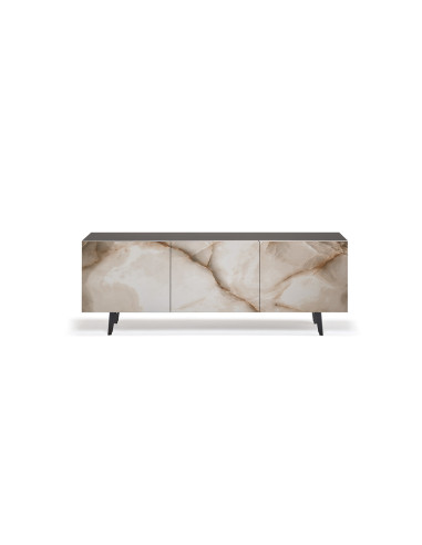 The Metropol sideboard, designed by Paolo Cattelan, captivates with its contemporary elegance and its clean, rigorous forms, enhanced by the choice of fine materials. The sideboard has a frame in graphite, white, black embossed wood or titanium lacquered wood. Base in matching embossed steel or titanium lacquered. Doors in Marble ceramic in the colours Alabaster, Supreme, Golden Calacatta matt, Golden Calacatta polished, Portoro matt, Portoro polished, Sahara Noir polished, Makalu, Breccia, Arenal, Corcovado, Kaindy, Borghini Calacatta matt or Borghini Calacatta polished with profiles in titanium embossed lacquered aluminium. The internal shelves are in transparent glass. Optional it is possible to have an internal drawer that can be positioned on each of the doors. Or a top in extra-clear etched glass painted white, graphite or black or in bronze mirrored glass.