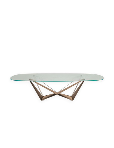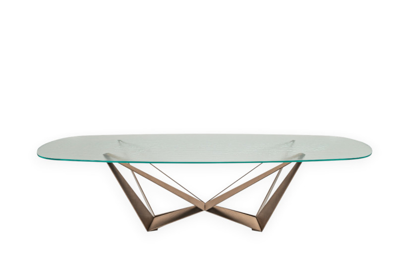 Technical Features: The base of the Skorpio Dining Table is made of painted steel with an embossed finish, or in brushed versions with special craftsmanship that determines the uniqueness of the result. The top is made of 15 mm thick glass in the standard versions, reduced to 12 mm in the 160x90, 182x90, and 200x106 formats. The top rests on the base.