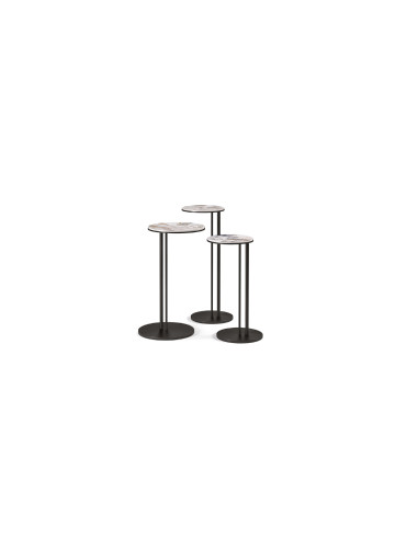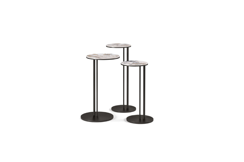 Designed by Paolo Cattelan, this collection is composed of three small tables with different height, cm 45, 50 and 55, designed to be combined or used individually. The Sting coffee table is marked by its versatile and sophisticated style, the top is made of Marmi ceramics available in Calacatta or Ardesia colours with a thin steel frame available titanium, graphite or black painted.