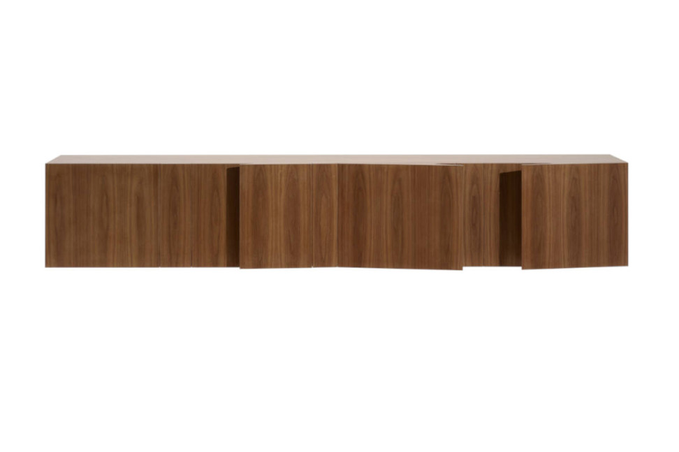 Blade sideboard is designed to be fixed to the wall and is equipped with 4 doors. The structure is in solid American walnut wood proposed in dark, brown, moka and natural finish, while the interior is in maple wood. The Blade suspended sideboard is 280 cm long, 55 cm deep and 50 cm high.