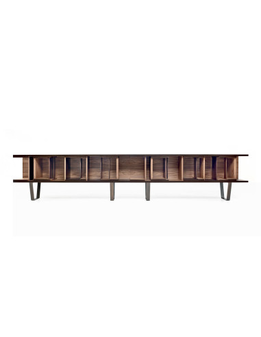 DC 200 / DC 250 is characterized by a wengè structure that rests on a steel base with a burnished brass finish. The interiors in American walnut are available in various finishes and the dividing panels are in wengè, American walnut and ebony. Proposed in two different lengths (200 cm and 250 cm), this wall anchored modular sideboard has been designed to accommodate also books and magazines in the internal compartments.