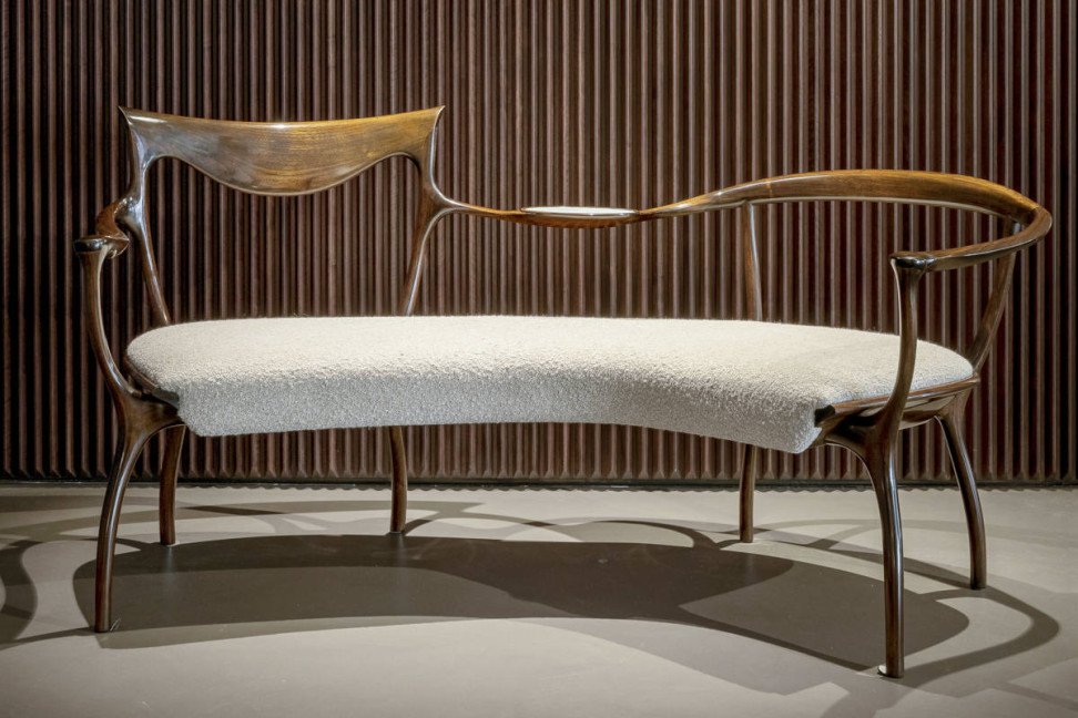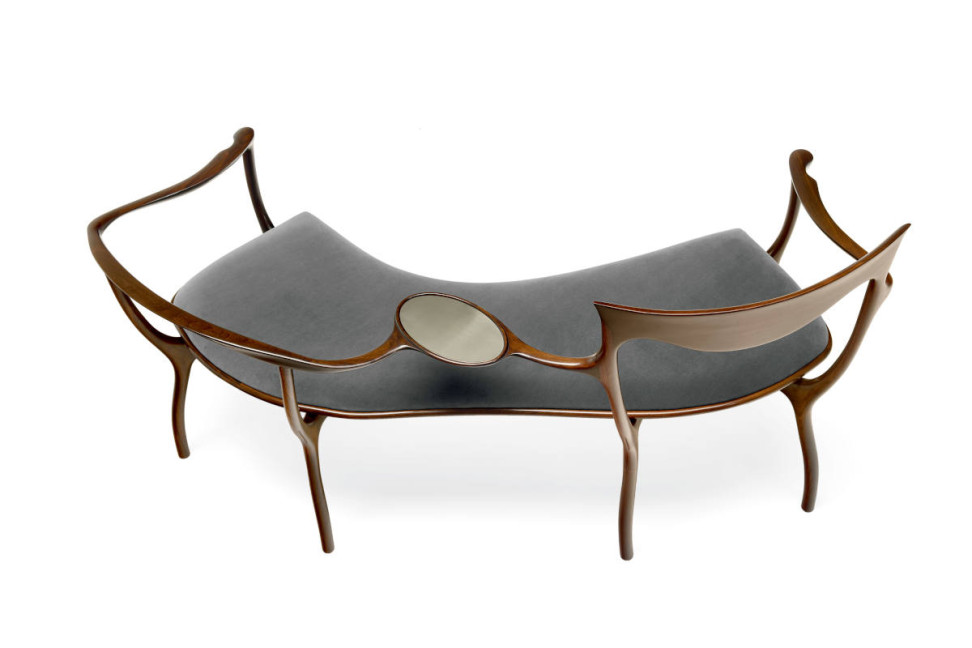 The structure in solid American walnut of the D.R.D.P. small sofa supports a tray in sandblasted glass with a silver finish, which acts as a point of union between the two asymmetrical halves of the backrest. The padded seat of the D.R.D.P. small sofa can be covered with fabrics or leathers from the Ceccotti samples page.