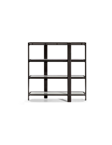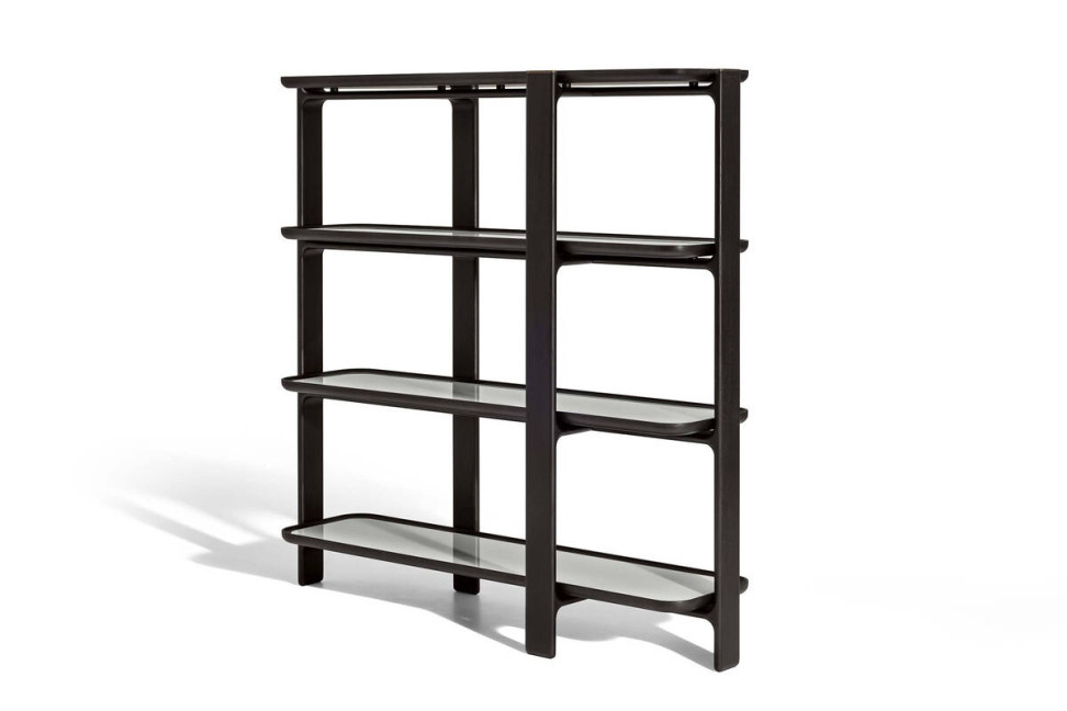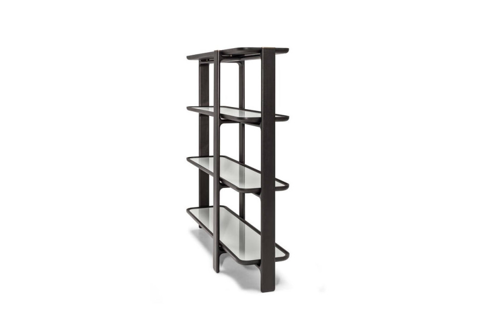 The Duo bookcase features staggered uprights and shelves framed by ash wood available in various finishes. Optionally marble or back-painted glass tops can be inserted within the shelf frames to give an even more elegant effect. The bottom of the shelves is made of poplar plywood veneered with ash in a finish that matches the rest of the frame.