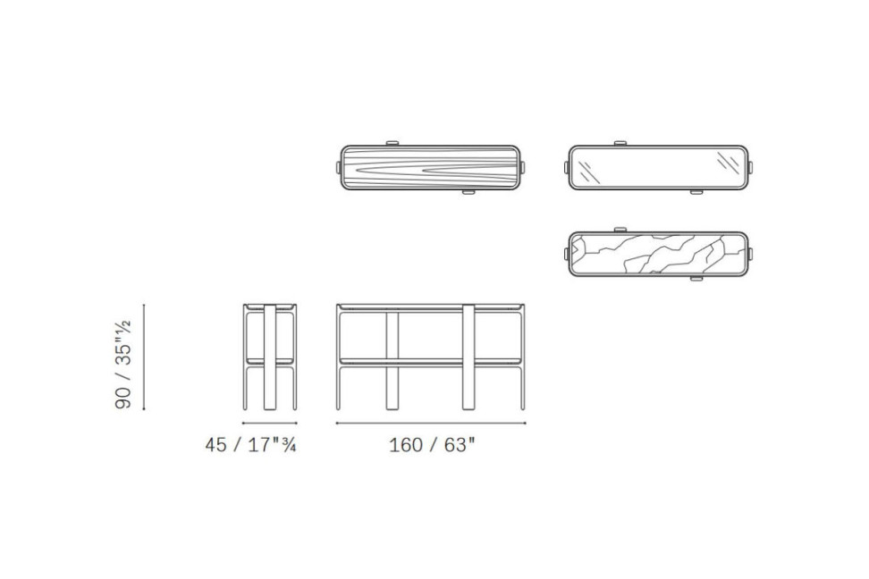 The Duo Console is a piece of furniture with an architectural approach, in which the solid ash frame with staggered uprights is softened by the slightly rounded shapes of the shelves, which can be made of wood, painted glass or marble. The bottom of the shelves is made of poplar plywood veneered with ash in the same finish chosen for the frame. Metal details with a shaded bronze finish add an extra touch of class and sophistication to the overall design.