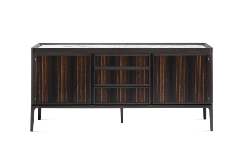 There are numerous possible configurations of the Full furnishing element, such as the high version with two doors, with drawers, or with drawers and doors; there is also a low version, available in the solution with doors and in that with drawers. There is a really wide customization possibility: the base and the structure are in solid American walnut, while the doors, the sides and the fronts of the drawers can be in ebony, lacquered or covered in fabric or leather, with glass shelves. It is also available an extra version, which includes doors, sides and drawer fronts covered with solid American walnut strips.