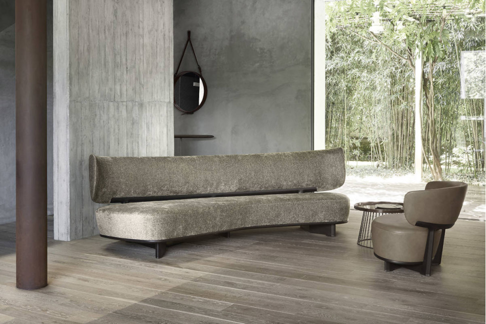 Icosofà sofa is characterized by the elegant structure in solid American walnut and brass feet. Icosofà is available in two different sizes, as well as in an asymmetrical version that offers all the comfort typical of sofas with chaise longues. The sofa can be covered with fabrics or leathers from the Ceccotti catalog.