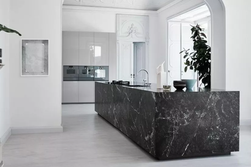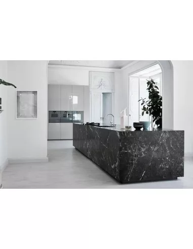 Cesar's N_Elle kitchen was thought of as a revival of the Elle project, from which it takes up the decisive lines, harmonizing and lightening them thanks to the introduction of 45-degree profiles of the tops and doors.The thickness of the doors at 2.2 cm being thinner and more refined, gives N_Elle a dynamic and balanced style. Cesar's kitchen has also renewed its multi-functionality, exploring new models and compositions with modular and customizable wall units, making it very appealing choice. The Cesar N_Elle kitchen system is available in many finishes from laminates to essences such as natural oak or thermocable oak, from ceramics to marble like the Grey Saint Laurant and many chromatic solutions of great harmony and modernity.