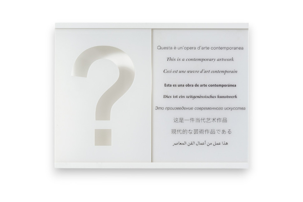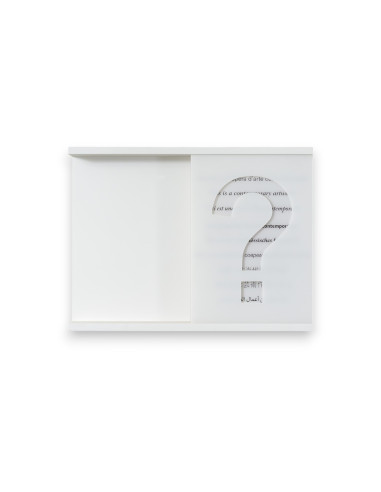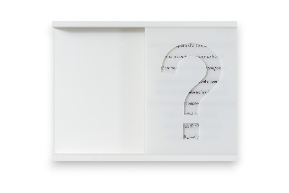 The kinetic artwork titled Contemporary Work of Art, born from the creative genius of Sandro Tomassini, features a lacquered wooden structure containing 11 plexiglass panels. The first panel is decorated with a question mark, ironically representing the question that the viewer asks when faced with a piece of contemporary art; the second panel explicitly states that it is a modern artwork.