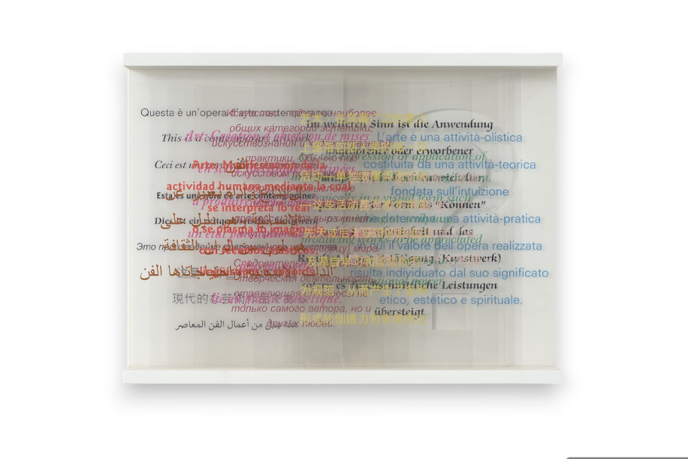 The other "pages" contain texts, each taken from the dictionary of a specific country, expressing what is meant by art; the writings are made with different fonts and colors, through which the author has evoked the various nationalities involved: thus, Italy is represented by blue, Spain by red, China by yellow, Arab countries by brown, and so on.