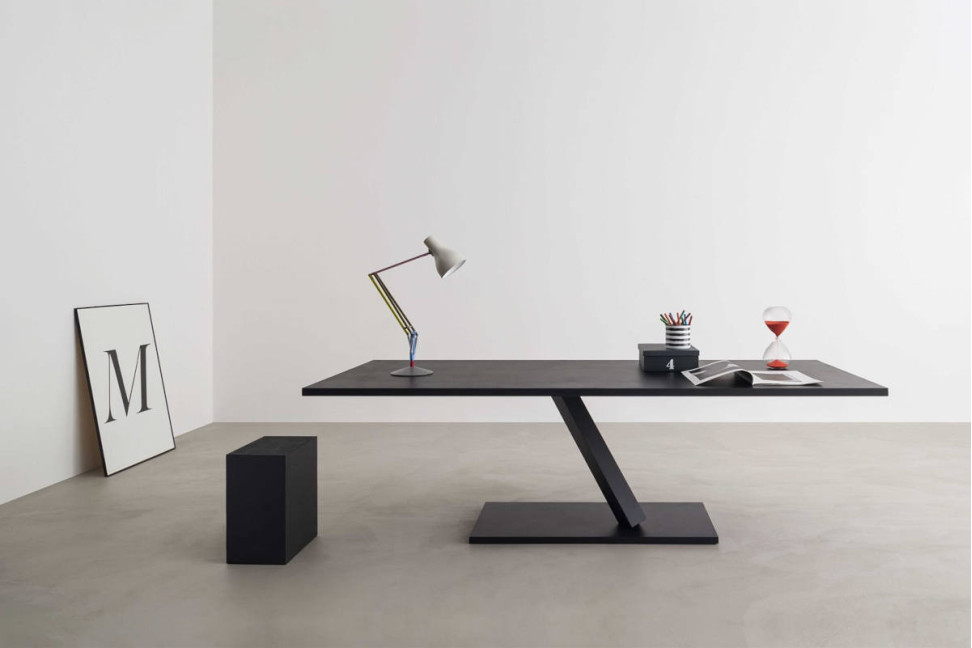 The Element table by Tokujn Yoshioka in collaboration with Desalto, consists of a central support, poised between two horizontal elements, as if defying gravity in a suspension between heaven and earth, between past and future. The sensation of dynamic balance is made even more concrete by the black cement finish. A particularly complex design that expresses all the experience of this brand in metalworking. The table is available in a round version, with a rectangular top or in a console version.