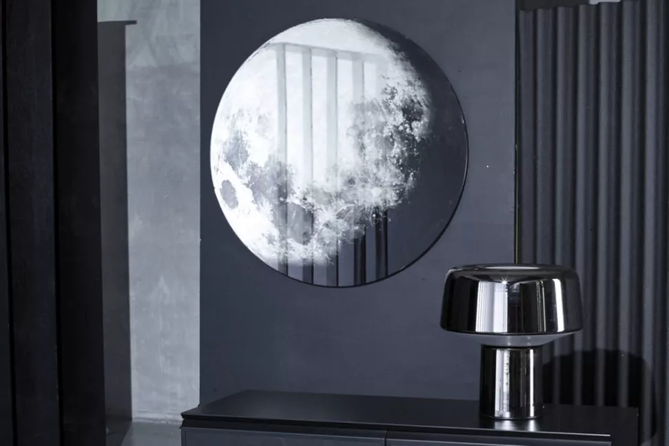 The My Moon My Mirror is one of the most beloved modern designer mirrors produced by the luxury brand Diesel. My Moon My Mirror is the perfect furnishing accessory when you want to give a room a unique character without weighing it down. The silkscreened lunar surface on the tempered glass creates a magnetic effect: it's not just a mirror, it's an emotional light source, a dramatic presence that truly changes the perception of space. In a living room, an entryway, or above a console table, it instantly becomes a striking detail.