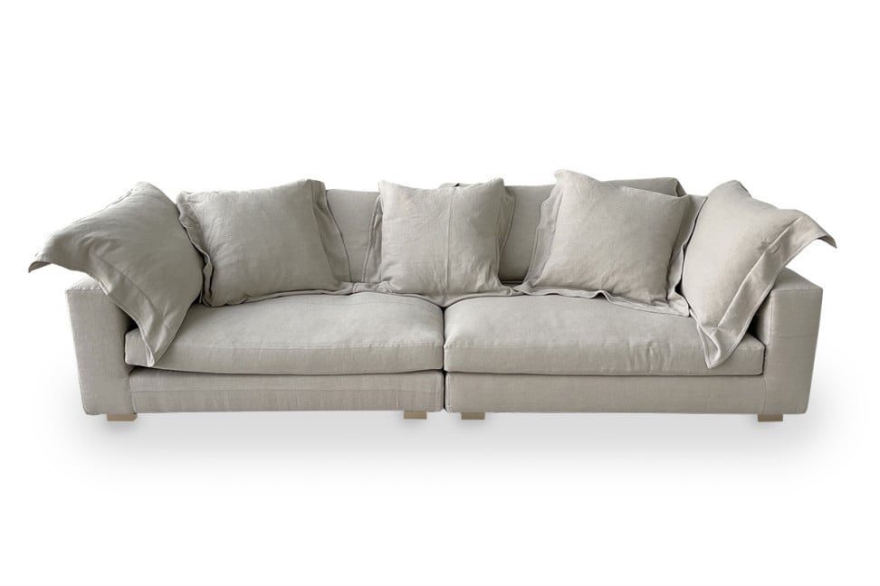 The Nebula Nine Sofa d.110 by Diesel with Moroso on Expo Offer in our showroom features natural ash feet and is characterized by a light hemp-colored linen covering.
