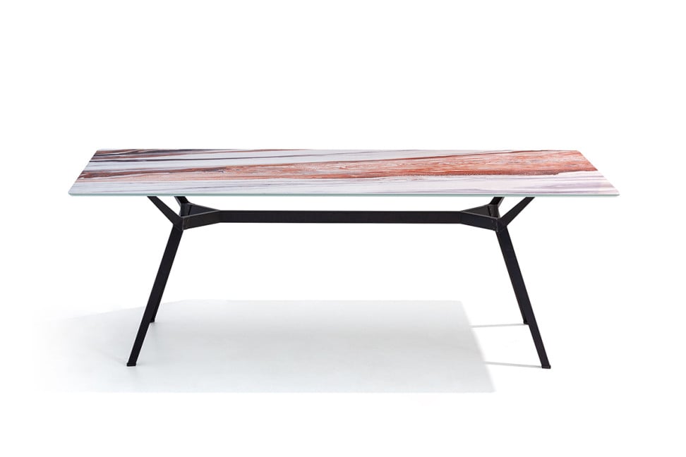 Pylon tables are characterized by the slender steel pillars that form the support base. The metal of the base has been combined harmoniously with the marbled effect of the top, in perfect Diesel style.