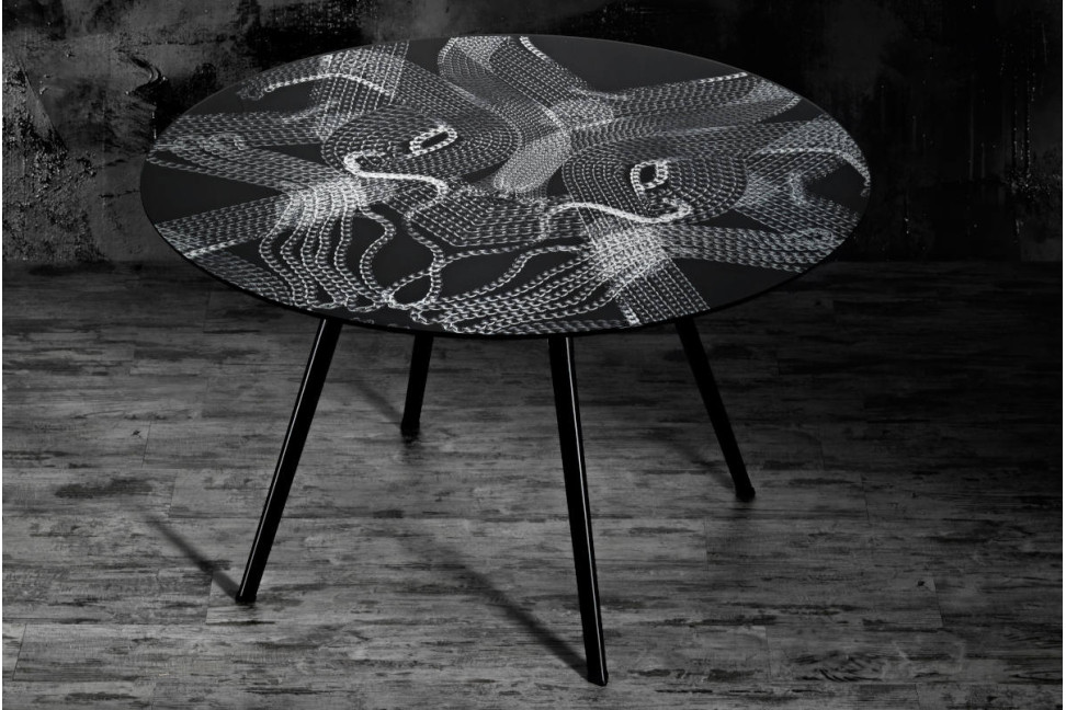 The Pylon tables are chracterized by the graphics of the crystal surfaces, more ethereal and sophisticated, combined with the a black metal or chrome structure, with a more industrial, practical feel. The decorations subjects realized on the plane, emblem of the Diesel style, are a tangle of chains or crystallized prisms reflected.