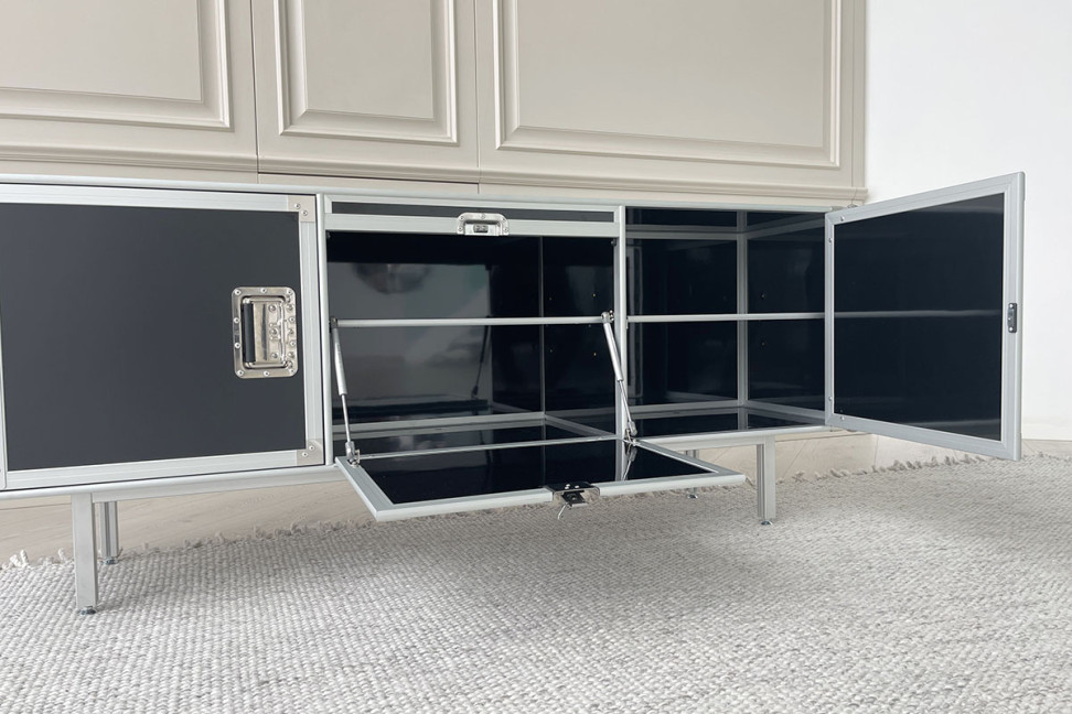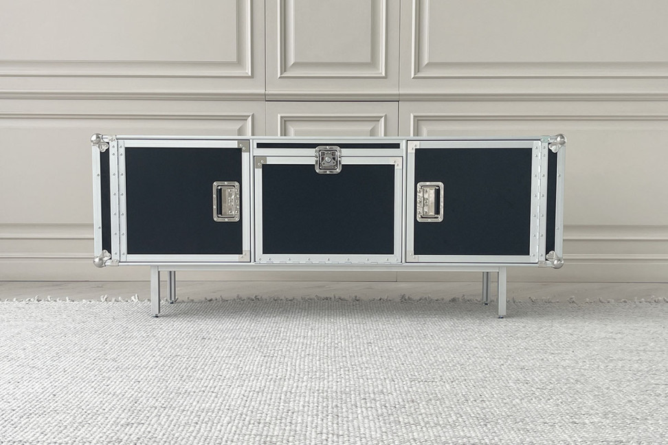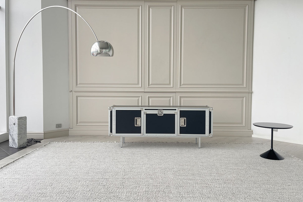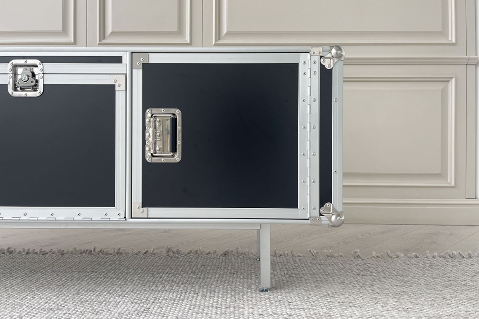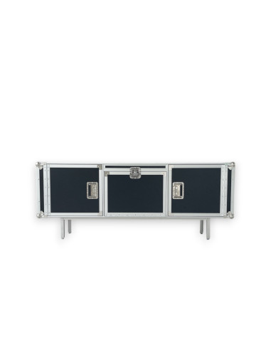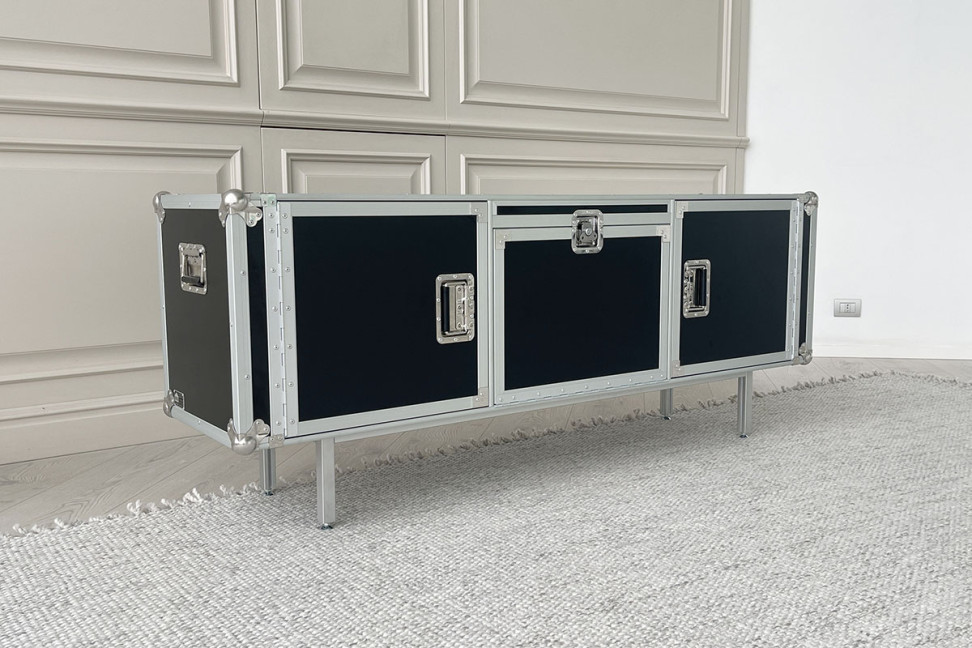 The Total Flightcase Sideboard on expo offer in our showroom has three doors and is made of laminated plywood and extruded aluminum, ensuring resistance and durability. The handles of Total Flightcase Cupboard are silver-colored chrome-plated steel: a touch of elegance that contrasts with the dark colour of the sideboard. The Total Flightcase storage unit is finished in matt black, reflecting the rebellious, rock spirit of the design. The interior features a glossy black finish, emphasizing the product's allure.