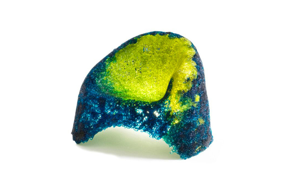 The Alice Armchair is available in various color options, achieved through the use of plastic filaments in fluorescent shades. Each piece is unique, handcrafted with an artistic gesture that makes its semi-transparent texture visible.
