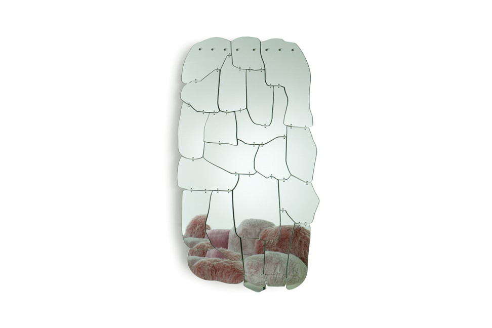 The Miraggio mirror by Edra designed by Fernando and Humberto Campana is made by binding different shaped colored mirrored methacrylate silhouettes with colored nylon straps.