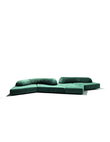 The On The Rocks outdoor sofa by Edra, designed by Francesco Binfarè, consists of four independent elements with irregular shapes: three polygons and one quadrilateral, all supported by polypropylene and rubber feet. Combined in various ways, they offer a wide range of configurations. Their modularity, governed by the laws of planar geometry, allows for an exponential multiplicity of solutions. The shapes, free of shells and rigid supports, are hand-molded in a patented mixture of Gellyfoam® and other foams, ensuring a unique and almost sensual softness.