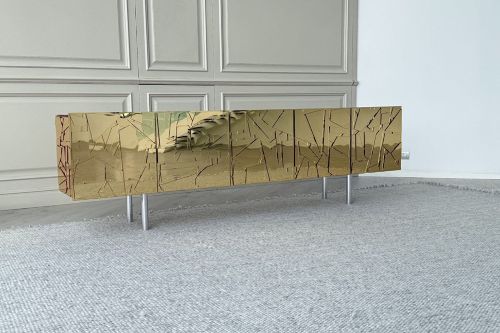 Technical Features: The structure of the Scrigno Storage Unit is made of wood, lacquered with metallic paints and covered with laser-cut reflective Coloreflex methacrylate shapes, applied by hand. The wing doors conceal shelves made of lacquered wood and glass, while the drawers slide on full-extension guides. The base is made of steel with adjustable feet; in some versions, there are glossy brushed aluminum legs.