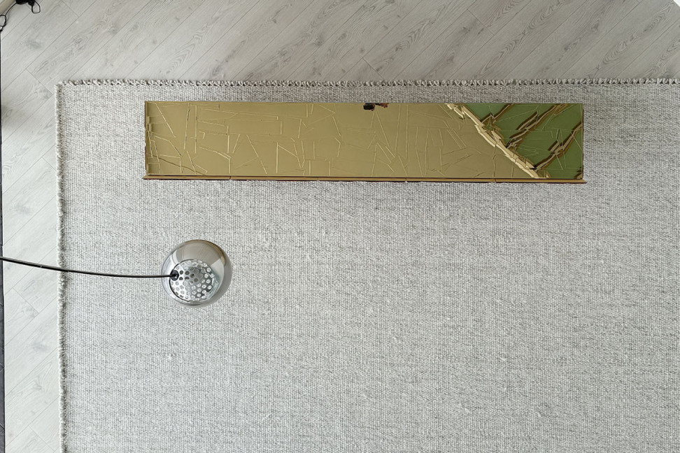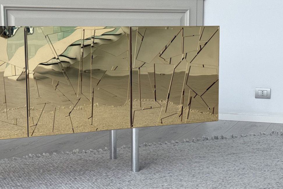 The external surfaces of the Scrigno are a true feast for the eyes, composed of a mosaic of mirror shards, giving the piece an artistic dimension, transforming it into a luminous and captivating sculpture. Light reflects off the surfaces, creating plays of reflections and illuminating the surrounding environment. The internal structure is designed to ensure strength and durability over time and is made of lacquered wood, enriched with special metallic paints that perfectly match the external coating. This synergy of colors creates a visual harmony, giving the piece a homogeneous and sophisticated appearance. The drawers and doors open and close smoothly, providing easy access and convenient organization of the items inside.