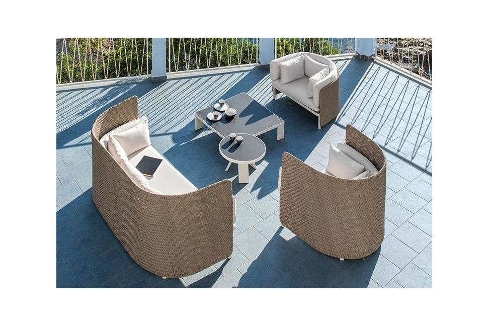 Technical Features: The main feature of the Esedra Garden Sofa is its resistance to weather conditions such as sun, rain, and humidity given by its sturdy aluminum frame and hand-woven synthetic fiber details that mimic rattan. The choice of these materials ensures that its beauty remains unchanged over time. In addition, thanks to its state-of-the-art design, the Esedra outdoor sofa provides exceptional performance and minimal maintenance to keep the product in optimal condition.