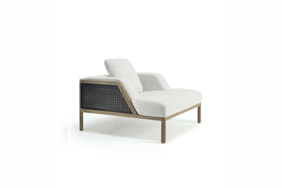 The collection is enriched with a new dining element inspired by the iconic bergère, suggesting a new idea of comfort at the table. The structure, with its pure and essential lines, is made of natural teak, while the backrest takes shape from the refined weave of acrylic rope, evoking the craftsmanship of ancient Vienna straw. The soft seat and back cushions, which have completely removable covers and are specifically designed for outdoor use, welcome the guest by providing support and increasing the feeling of well-being.