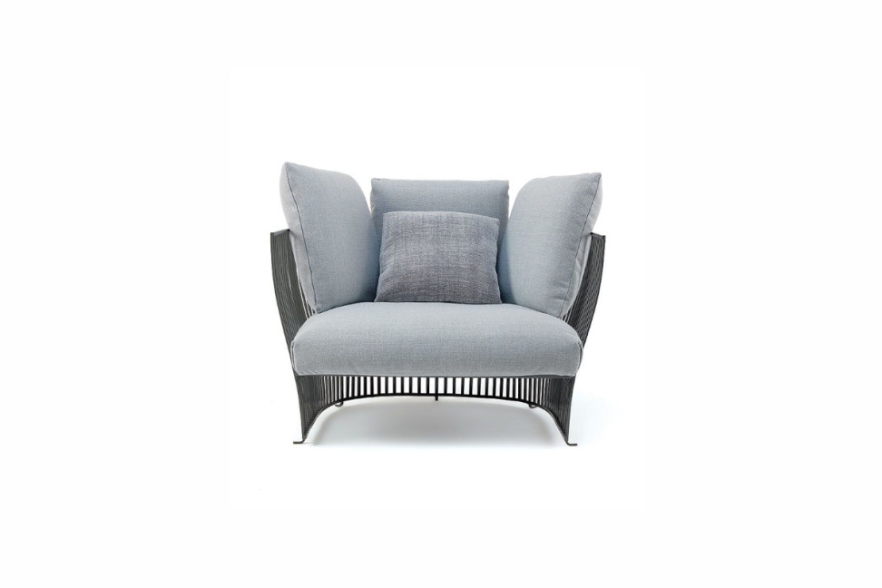 The Venexia armchair by Ethimo, created by designer Luca Nichetto, embodies a harmonious blend of traditional craftsmanship and modern innovation. It is characterised by sinuous lines and a light aluminium frame.