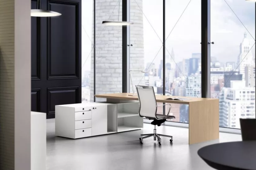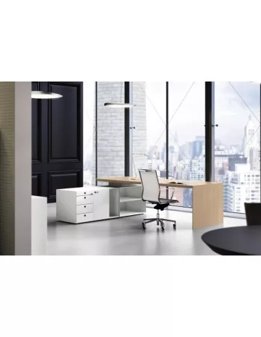 The MultipliCeo executive desk is extremely customizable thanks to the many finishes available, such as leather, oak and cedar, warm and refined woods that will give a touch of style to your office. The keywords of this collection are functionality and adaptability: a wide choice of work plans, storage unit, tables and compositions for every contemporary need. The MultipliCeo operative desk is designed for a refined and important environment, its hallmark is the unmistakable 45 ° profile that gives lightness and dynamism to the top.