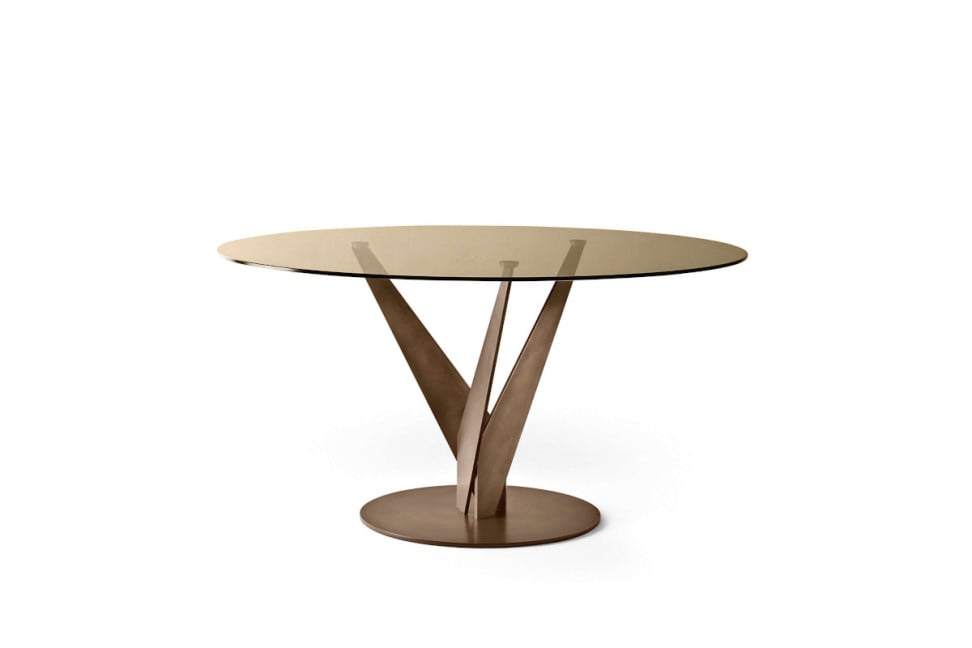 The Epsylon table by Fiam, designed by Fabio Di Bartolomei, is a round table with a metal structure and a glass top. This piece combines the elegance of glass with a design that withstands the test of time.
