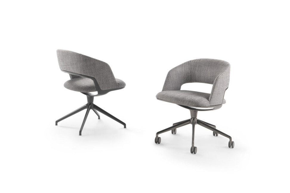 Featuring a molded frame made of patented material, this small armchair comes in three aluminum base versions: swivel with 5 spokes, swivel with 4 spokes and fixed base. The Alma armchair has an elegant style with a comfortable, enveloping seat. The upholstery is not removable and can be chosen from a wide range of fabrics and leathers from the Flexform collection.