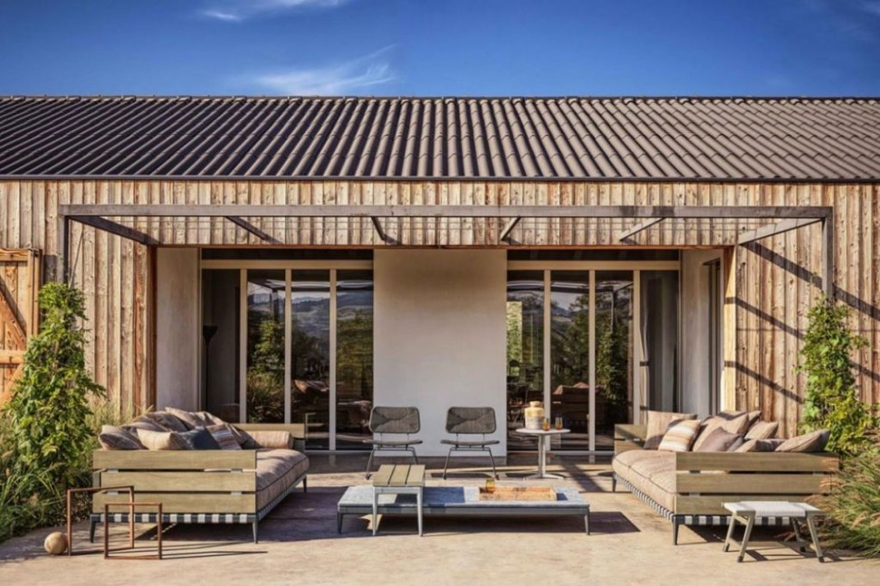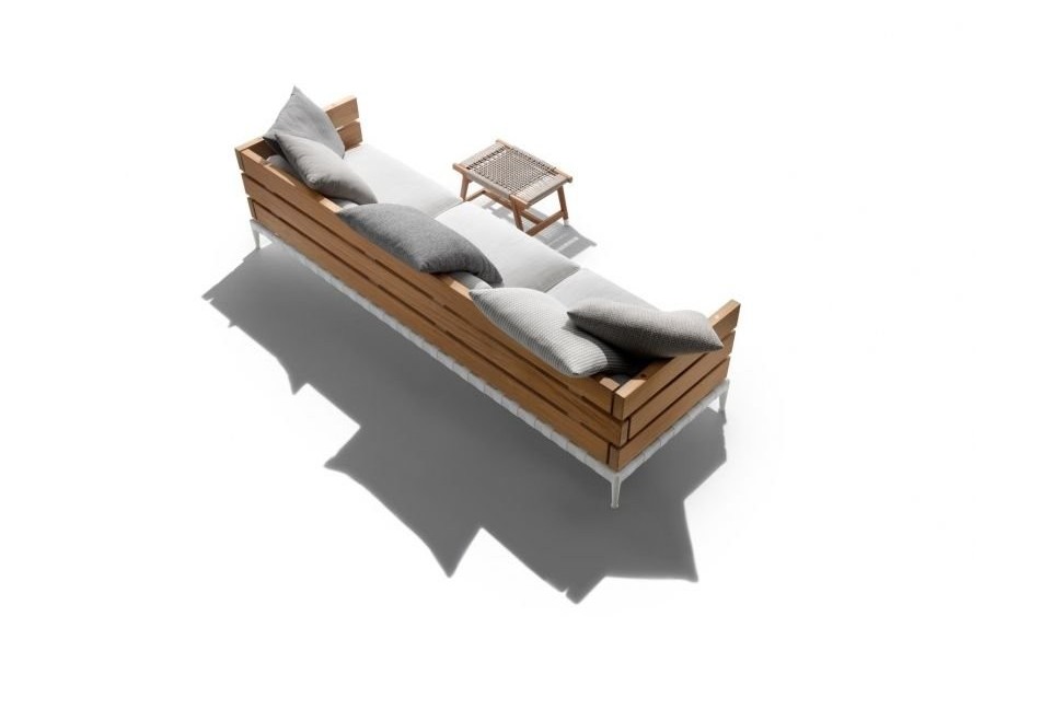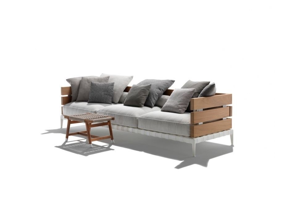 The Ansel outdoor sofa by Felxform is characterized by its base structure in epoxy powder coated stainless steel in a very wide range of colors, combined with that of the armrests and backrest in iroko slats.