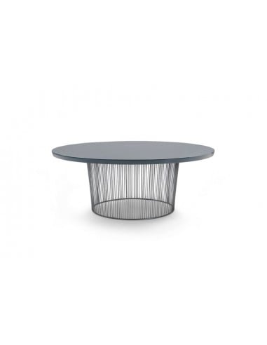 This table is characterized by a metal base, visually light and minimal. The base, made up of thin metal rods, is available in satin or chrome finishes. black chrome. Burnished and gunmetal color. The Berry table by Flexform is proposed with a circular top in three sizes, both in veneered wood in multiple finishes, and lacquered in various colors.