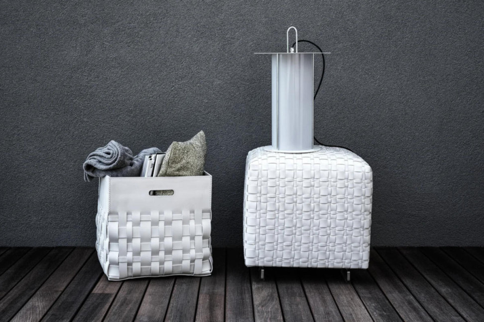 Indeed, this accessory can be used as storage bin or magazine holder in gardens and terraces, as a complement to sofas and armchairs; thanks to its practical openings on the sides, it can be easily moved, adapting to any need. The structure of Cesta Outdoor is made up of an hand-made polyurethane rubber woven that is available in two sizes and in a sophisticated range of colors.