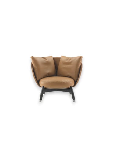 It can be customized in a wide range of fabric and leather coverings, offering the opportunity to create interesting combinations between the cushions and the seat shell. Combinations between internal fabric and external leather on the shell are also possible, while for the base, there is a choice of a wide variety of solid woods with different finishes. Even the feet finishes can be personalized, choosing from numerous color options.
