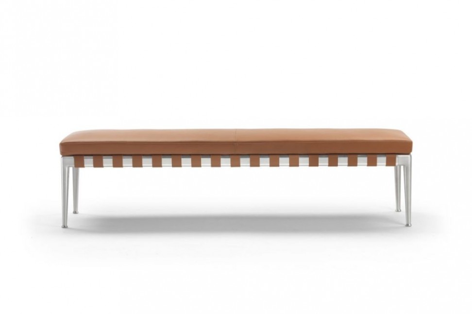 The Gregory bench is made in three sizes and characterized by an original metal base accompanied by leather, a warm and refined material with which the visible parts of the straps on which the seat cushions rest are made. The aluminum feet are available in different finishes while the leather is available in tobacco, dark brown, gray and black colors.