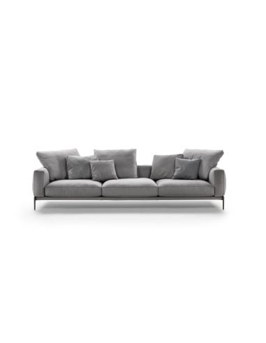 The Romeo sofa is characterized by a metal base that frames and raises the seat, giving an effect of lightness and modernity. The seat and backrest, upholstered in fabric or leather, are extensively padded to maximize comfort, thanks also to the possibility of adding decorative cushions.