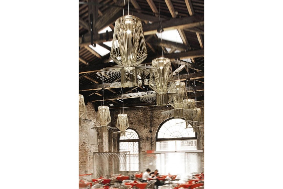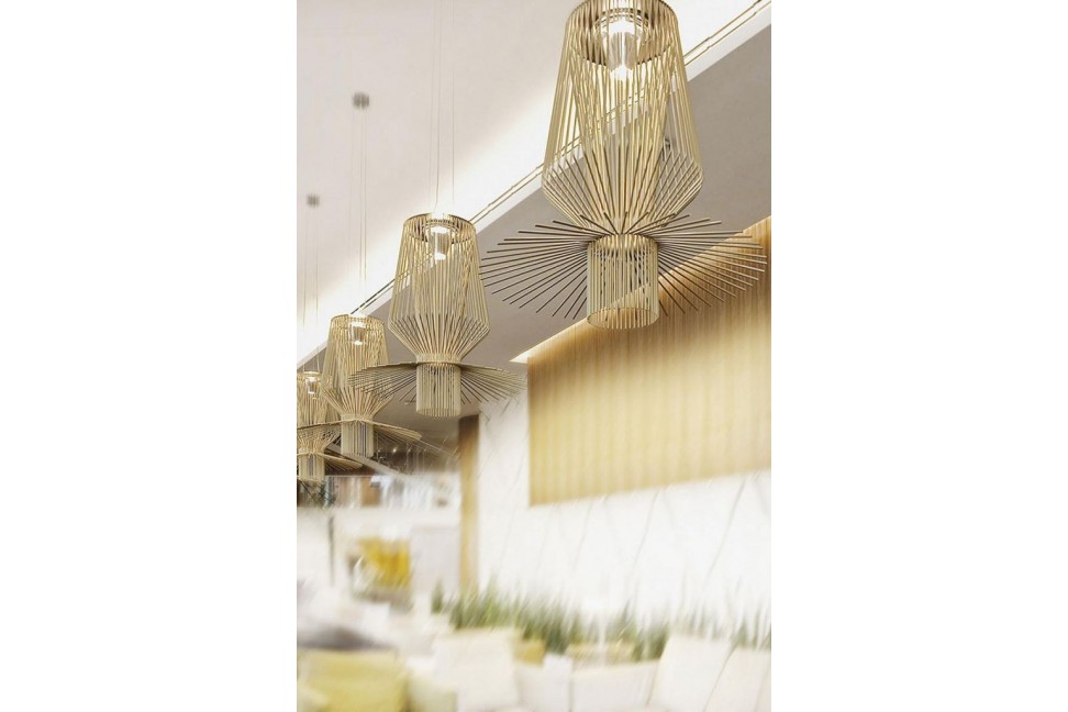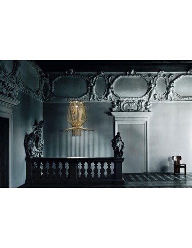 The Allegro suspension lamp collection is one of the lines signed by the Italian brand Foscarini, specialized in the production of design lamps.Allegro Assai was born from the creativity of the Atelier Oï team of designers and is characterized by a structure composed of thin rods made of rod-filled gold painted aluminum, placed close to each other, which give life to a set of dynamic and lively geometries that seem to move around the central metal structure. The components of Allegro Assai are enhanced by the diffused, direct and reflected light, and the musical sounds produced by their touching. The suspension lamp, available in one size only, is perfect for bright and welcoming environments with a modern and original style. The collection also includes the two models Allegro Ritmico and Vivace, different in color and shape.