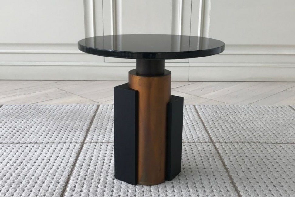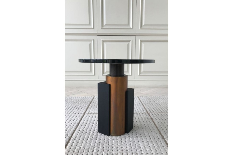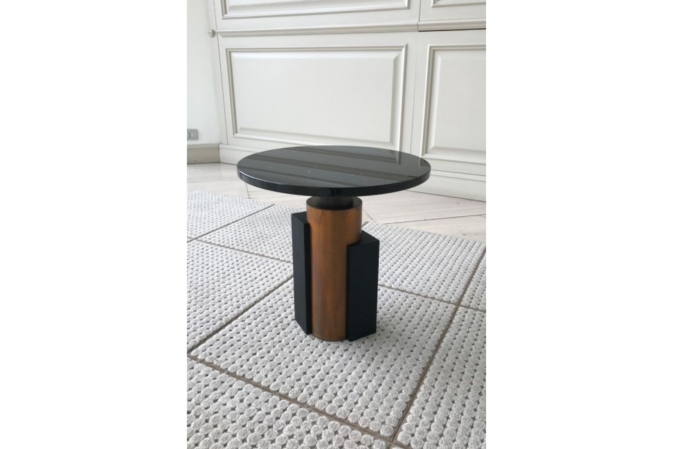 Black Marquinia marble top; structure in burnished brass with parts in open pore black lacquered wood.