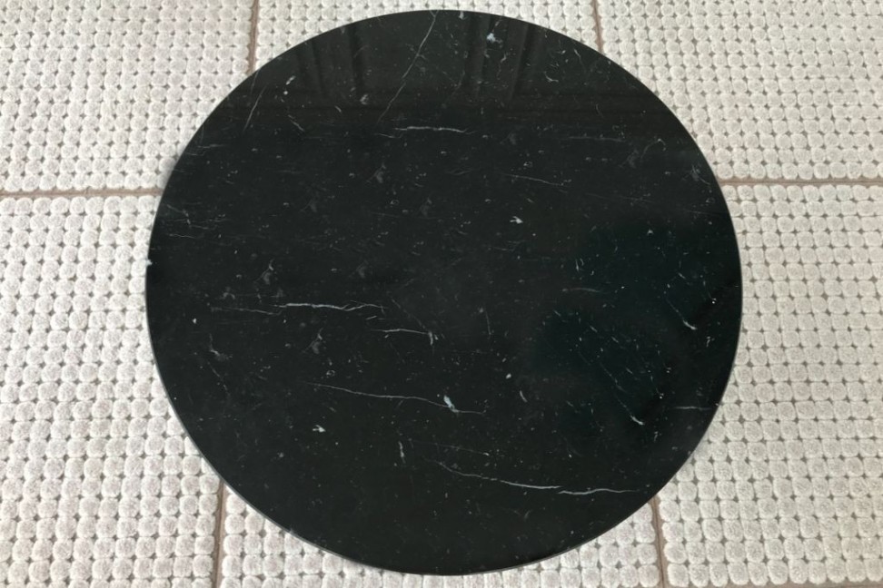 The 1968 side table in expo offer in our showroom is characterized by a circular top in black Marquinia marble and by an elegant hand-burnished brass structure embellished with black lacquered wood parts.