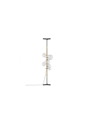 The dimmable Bolle Verticale floor lamp is the brainchild of designer Massimo Castagna, for Gallotti&Radice. It features a hand-burnished brass telescopic structure on which 7 mouth-blown clear crystal spheres are arranged. Featuring an extendable dark burnished metal part, the Bolle Verticale lamp adds a touch of elegance and originality to any room.