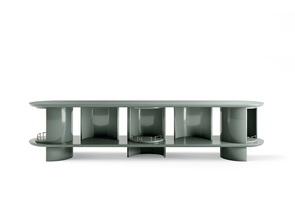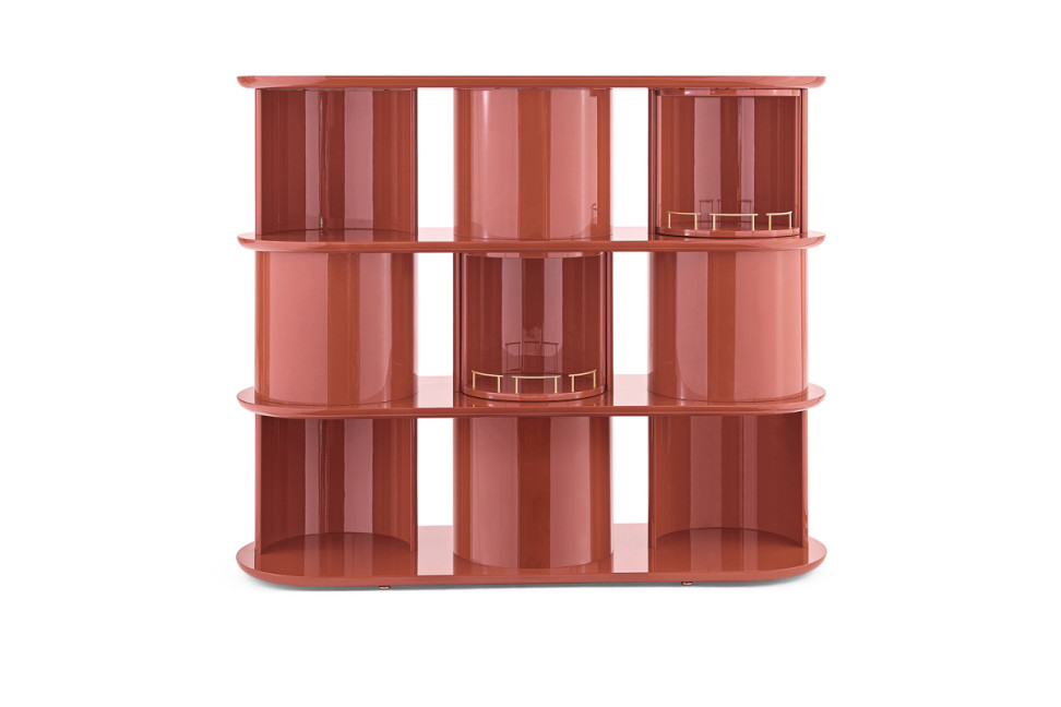 With the Hide&Seek storage cabinet, designer Russo has introduced a new line for Gallotti&Radice. The cabinet features a lacquered wooden structure, available in matte or glossy finishes in various colors. It is characterized by compartments in the shape of half cylinders, some closed and others open, with satin brass details.