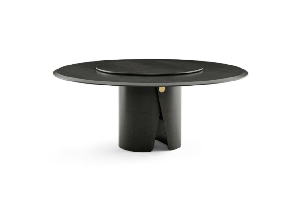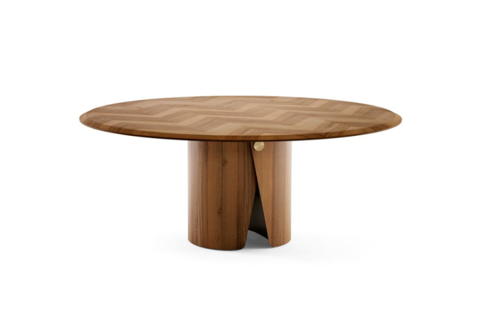 The Manto table, by designer Pietro Russo for Gallotti&Radice, in the wood version features an intriguing curved base with a satin-finished brass button. The top, inlaid with herringbone, is adorned with a bevel in a choice of finish. Manto is available in two different diameters. Upon request, a countertop swivel top is available in the same finishes as the top.